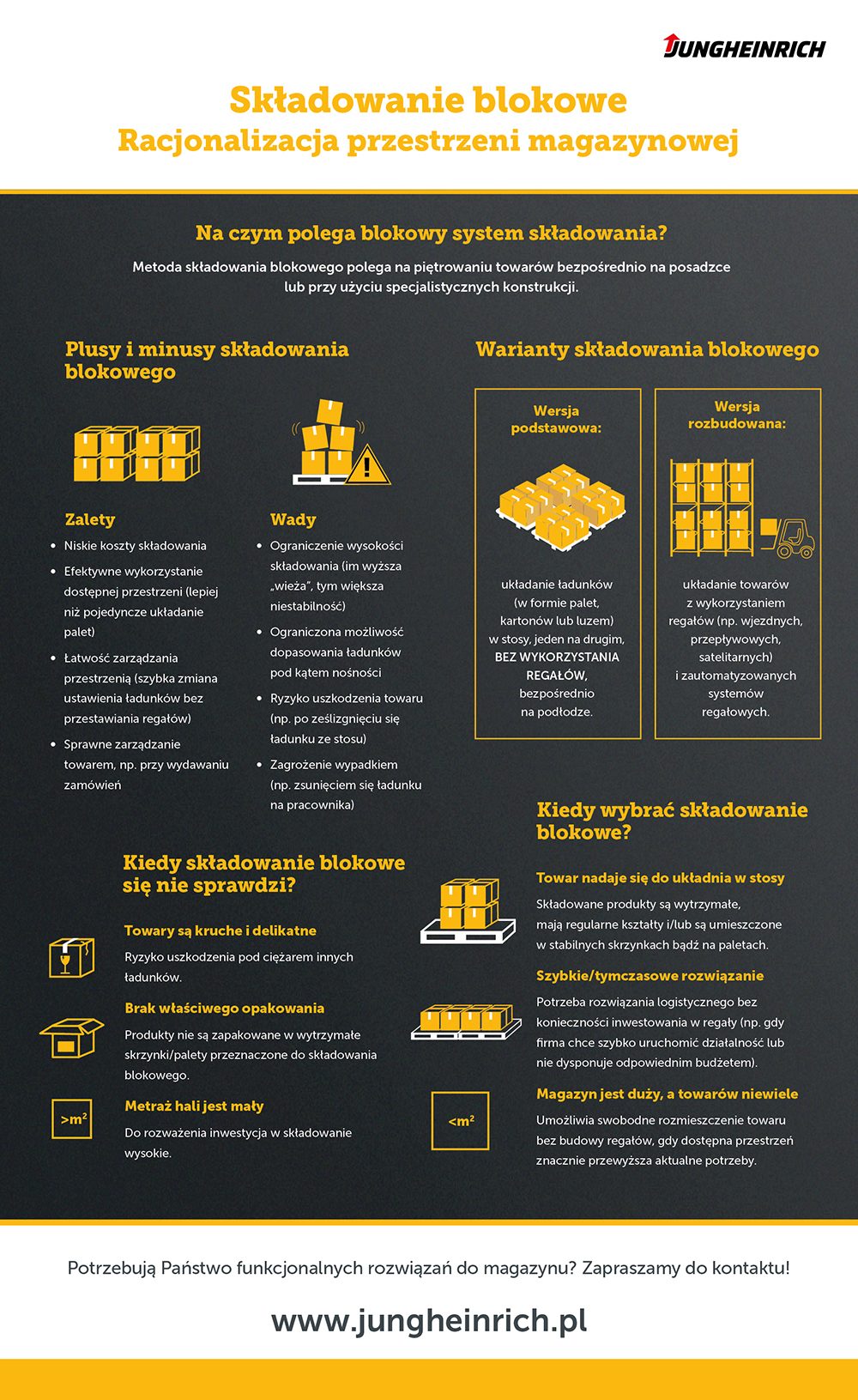 Wybierając sposób zarządzania magazynem, zawsze należy brać pod uwagę wszystkie wady i zalety składowania blokowego. Chcą Państwo zoptymalizować procesy magazynowe? Zachęcamy do przejrzenia asortymentu firmy Jungheinrich. To urządzenia dopasowane do Państwa potrzeb!